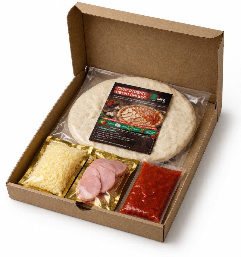 Набор для приготовления пиццы дома. Состав: тесто раскатанное, фермерская ветчина, сыр Моцарелла собственного производства, соус на выбор, инструкция по приготовлению.