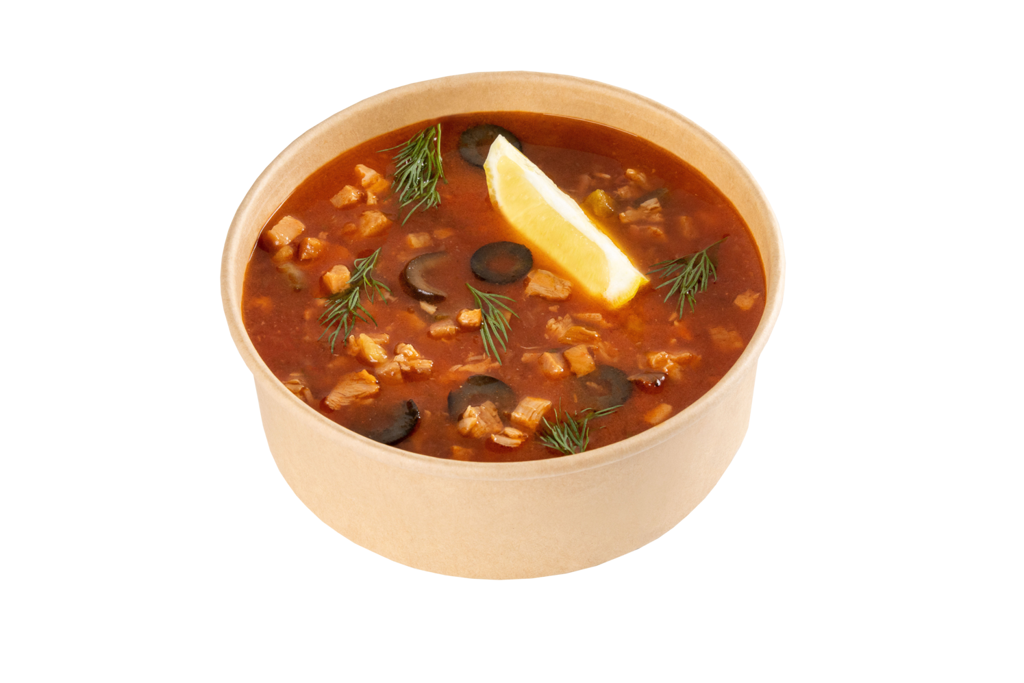 Куриный бульон, мясокопченности, маринованный огурец, маслины, лимон, сметана, зелень. 350 мл.
