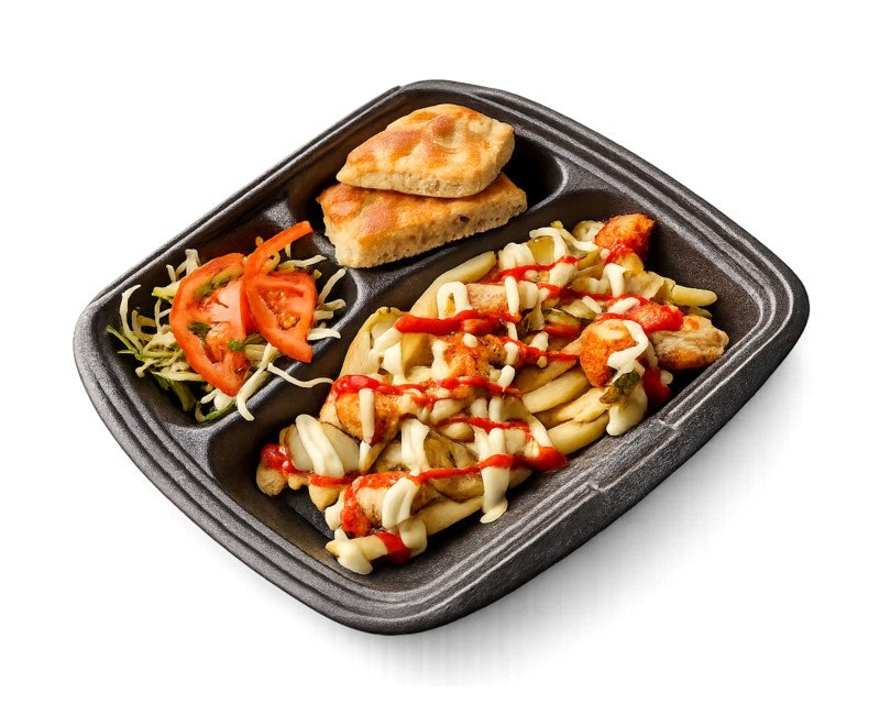 Картофель фри, стрипсы куриные, салат овощной, огурец маринованный, соус чесночный, кетчуп, лепешка. Вес 270 г.