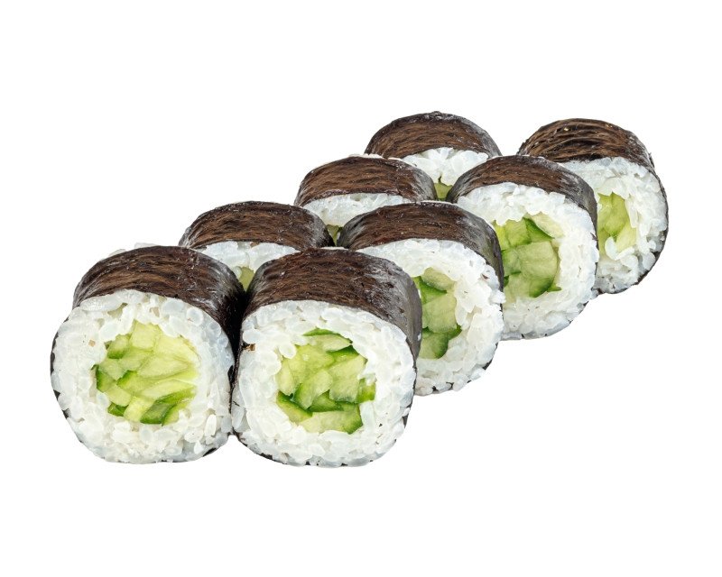 Огурец свежий, рис, нори. Вес 160 г. К порции идет соевый соус, имбирь, васаби.