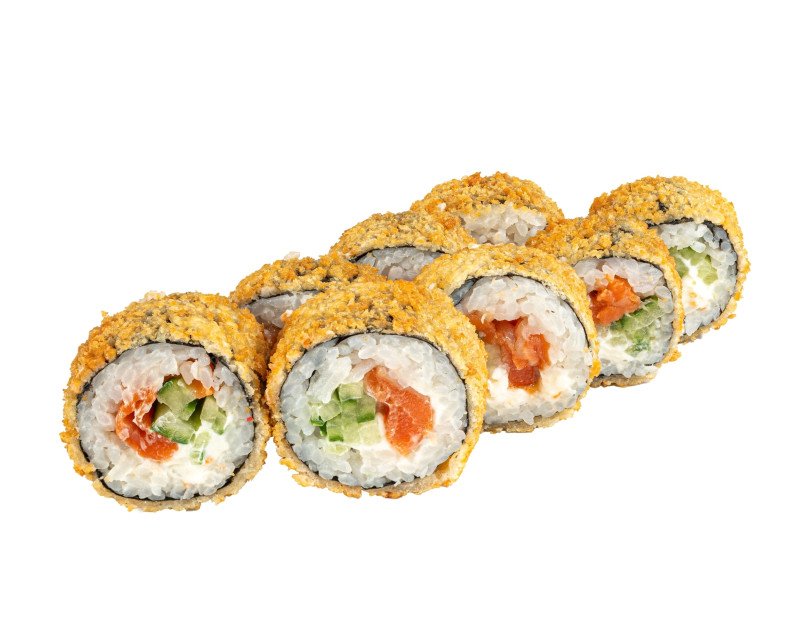 Лосось, сыр творожный, огурец свежий, сухари панировочные, кляр, рис, нори. Вес 230 г. К порции идет соевый соус, имбирь, васаби.