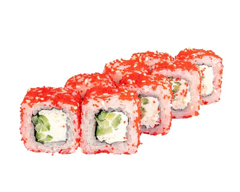 Крем-краб, сыр творожный, огурец свежий, рис, нори, икра масаго, кунжут. Вес 200 г. К порции идет соевый соус, имбирь, васаби.