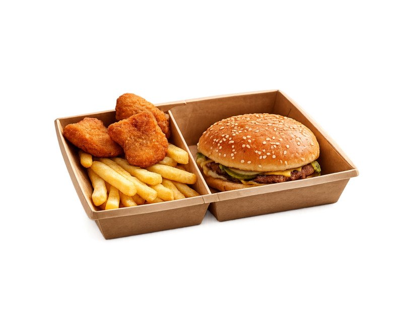 Чикенбургер, картошка фри, наггетсы куриные 3 шт. В индивидуальной кратфовой упаковке.